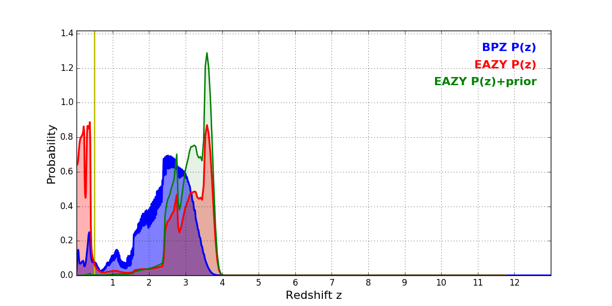 In P(z) plots: Yellow lines mark the cluster redshift z = 0.505,