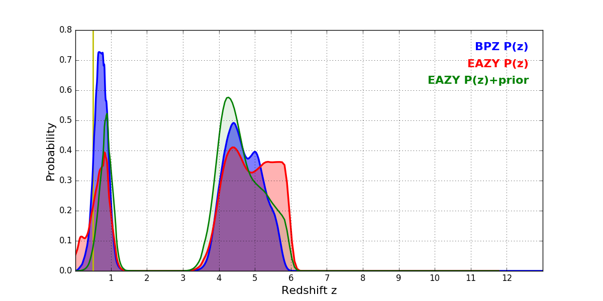 In P(z) plots: Yellow lines mark the cluster redshift z = 0.505,