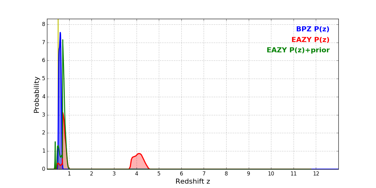 In P(z) plots: Yellow lines mark the cluster redshift z = 0.505,
