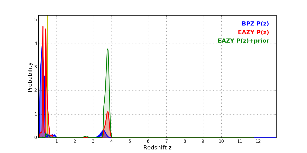 In P(z) plots: Yellow lines mark the cluster redshift z = 0.505,