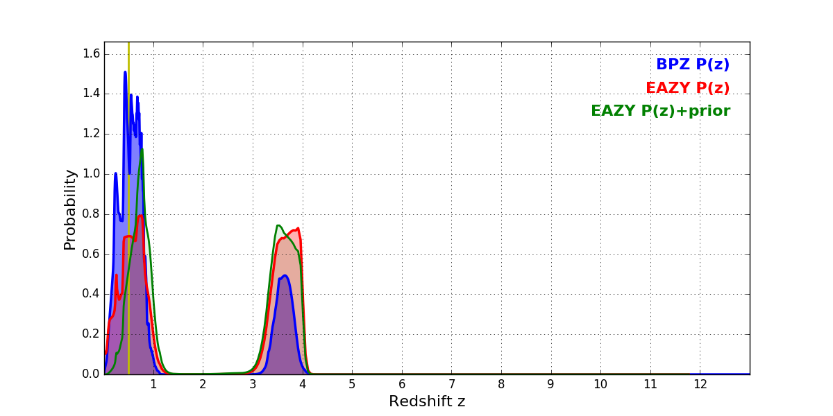 In P(z) plots: Yellow lines mark the cluster redshift z = 0.505,