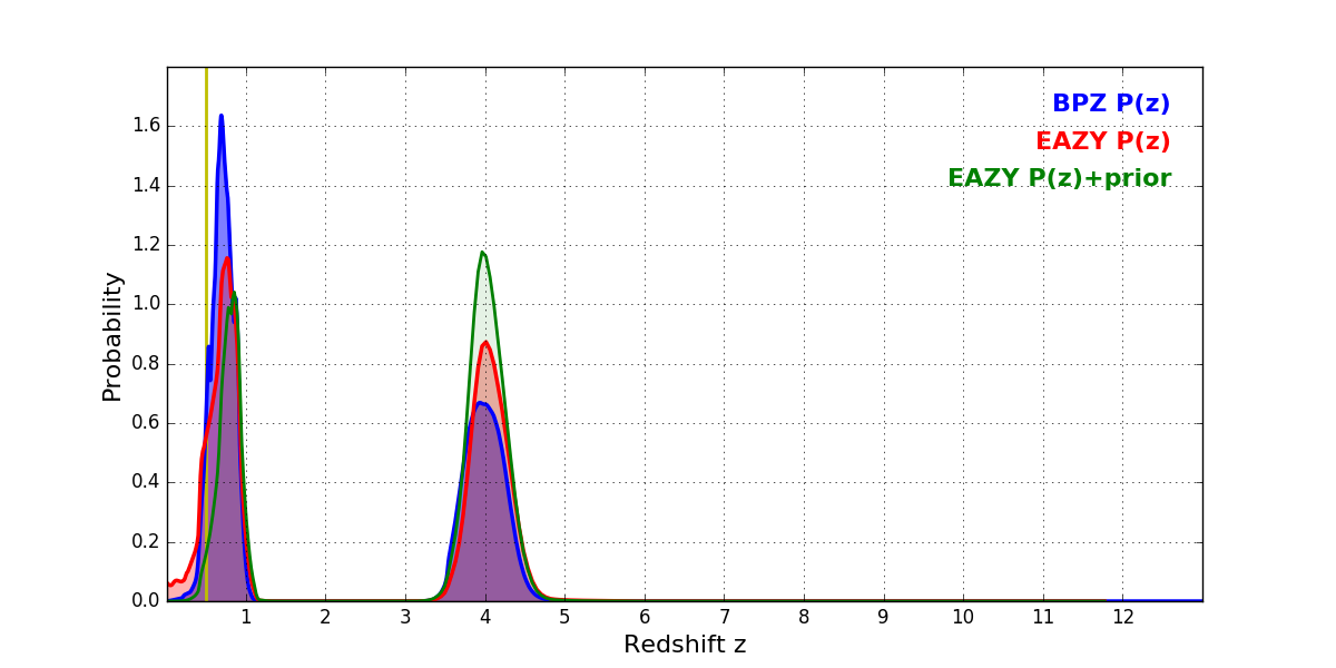 In P(z) plots: Yellow lines mark the cluster redshift z = 0.505,