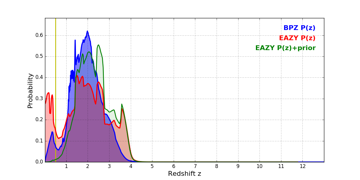 In P(z) plots: Yellow lines mark the cluster redshift z = 0.505,
