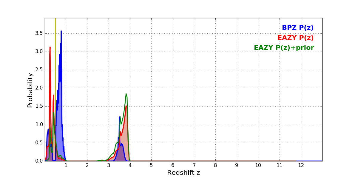 In P(z) plots: Yellow lines mark the cluster redshift z = 0.505,