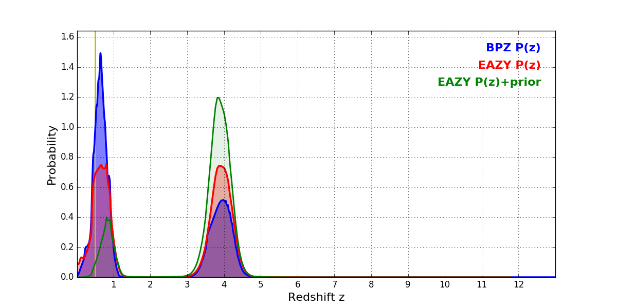 In P(z) plots: Yellow lines mark the cluster redshift z = 0.505,