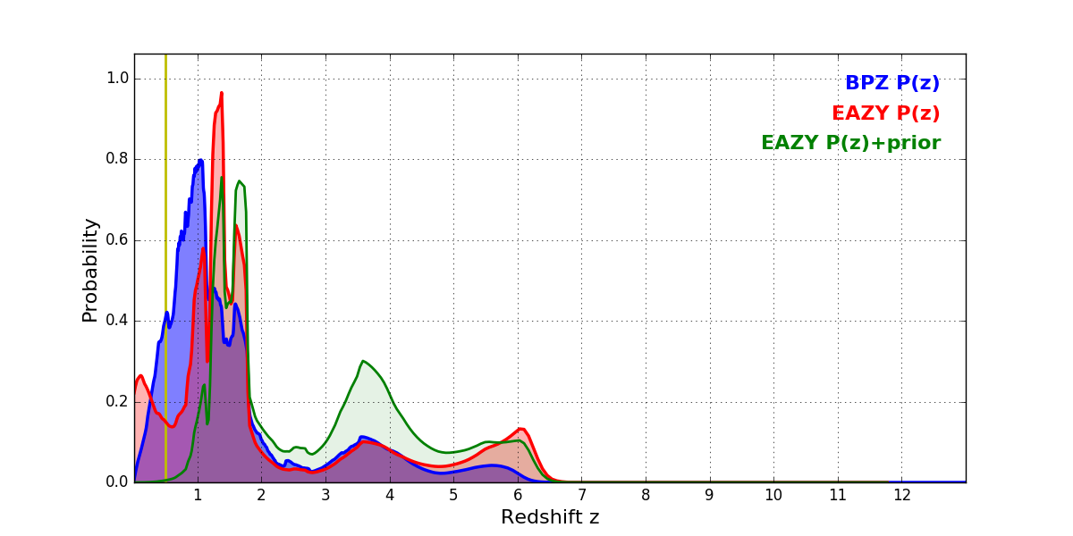 In P(z) plots: Yellow lines mark the cluster redshift z = 0.505,