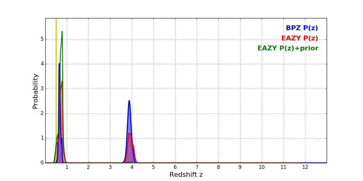 In P(z) plots: Yellow lines mark the cluster redshift z = 0.505,