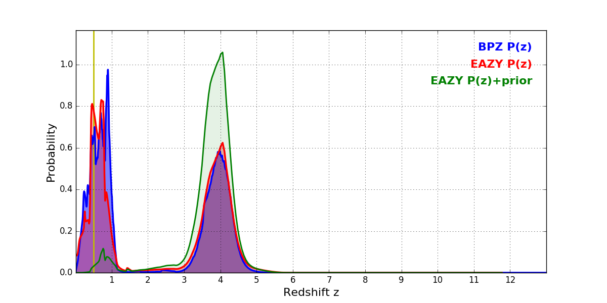 In P(z) plots: Yellow lines mark the cluster redshift z = 0.505,