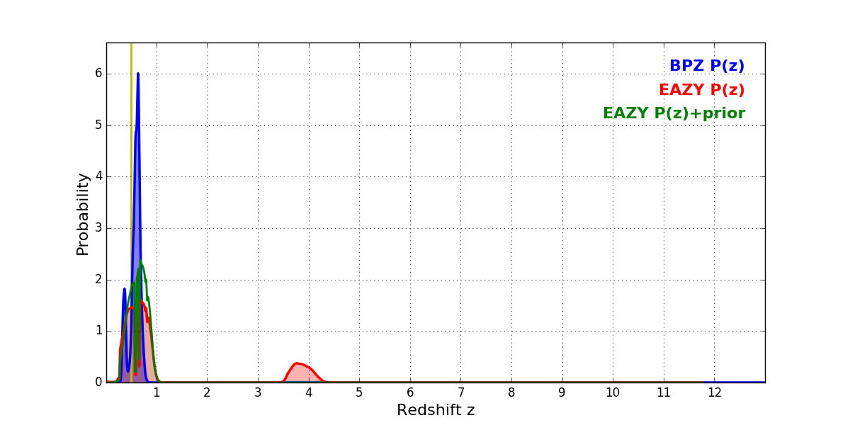 In P(z) plots: Yellow lines mark the cluster redshift z = 0.505,