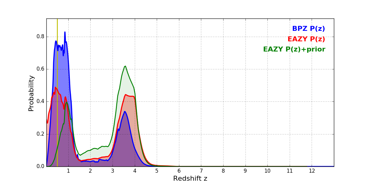 In P(z) plots: Yellow lines mark the cluster redshift z = 0.505,