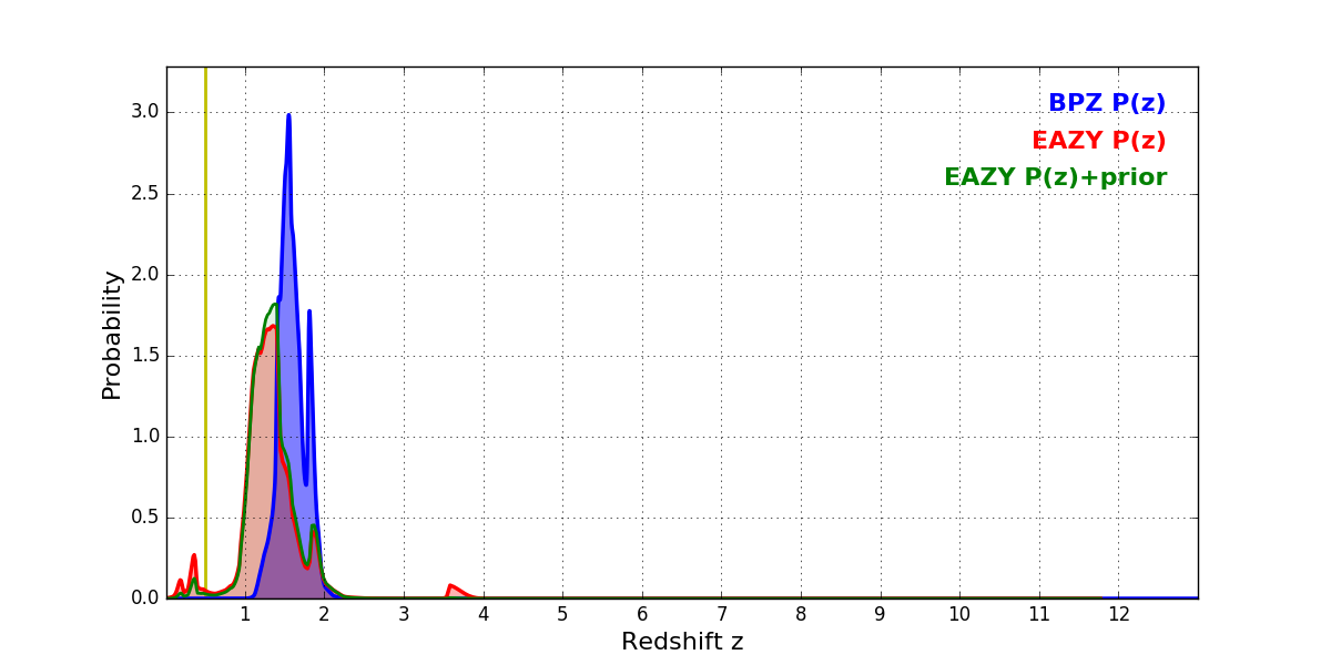 In P(z) plots: Yellow lines mark the cluster redshift z = 0.505,