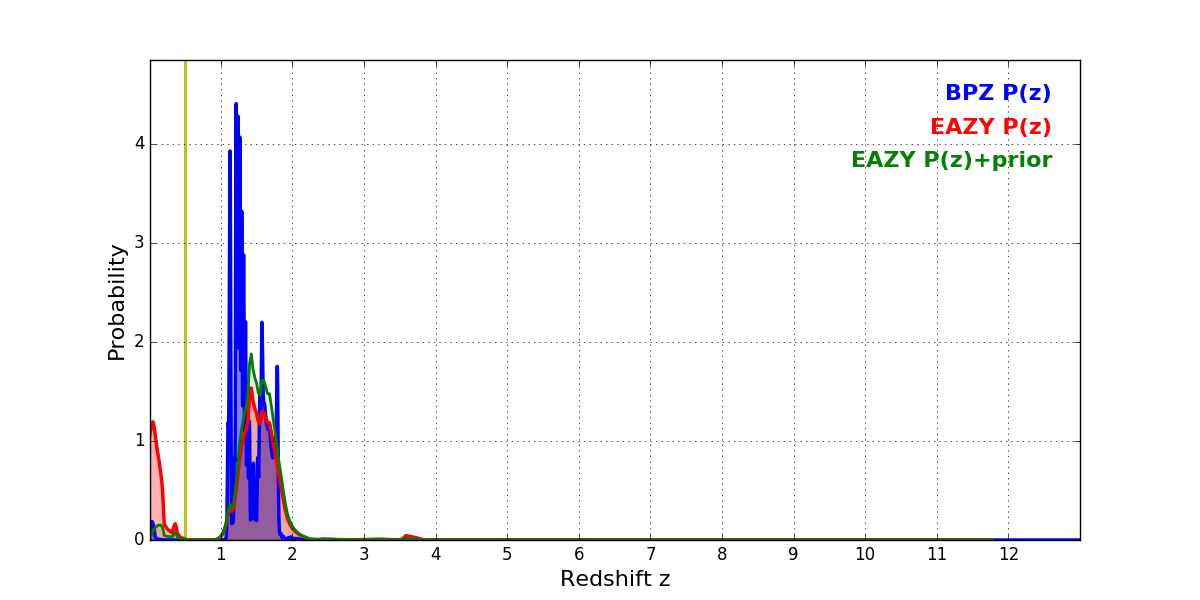 In P(z) plots: Yellow lines mark the cluster redshift z = 0.505,