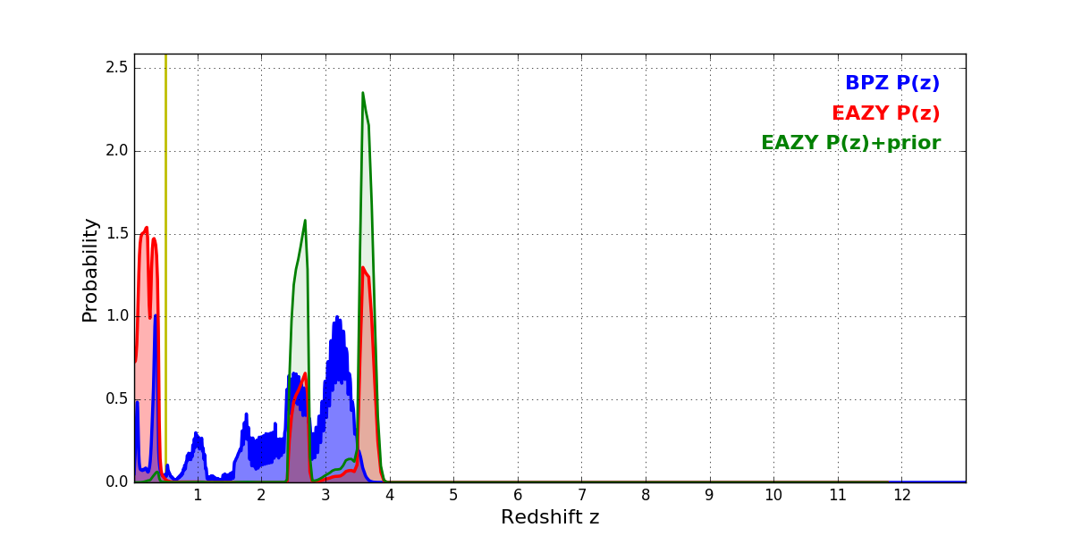 In P(z) plots: Yellow lines mark the cluster redshift z = 0.505,