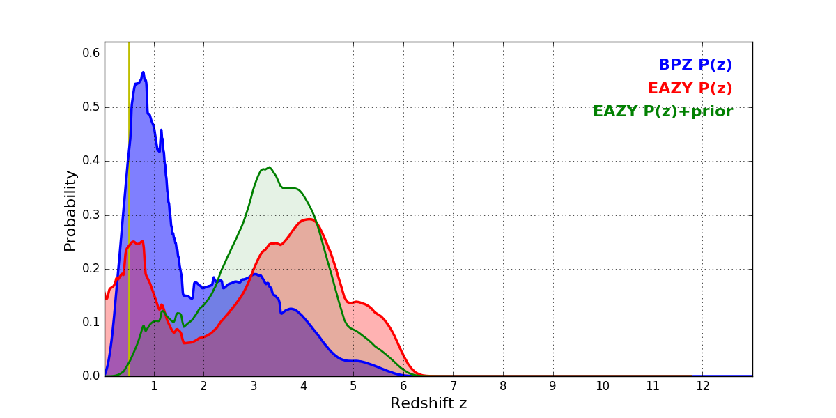 In P(z) plots: Yellow lines mark the cluster redshift z = 0.505,