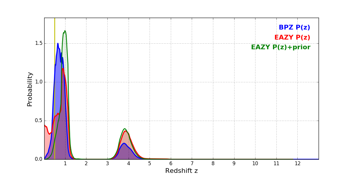 In P(z) plots: Yellow lines mark the cluster redshift z = 0.505,