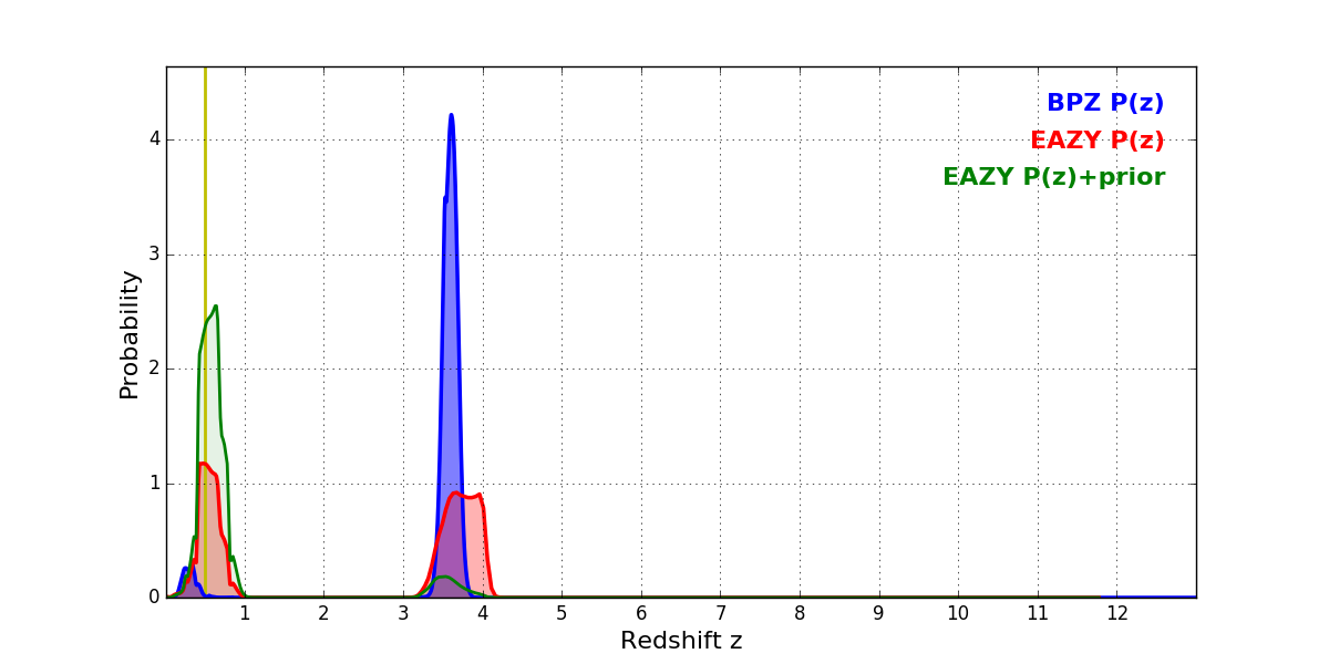 In P(z) plots: Yellow lines mark the cluster redshift z = 0.505,