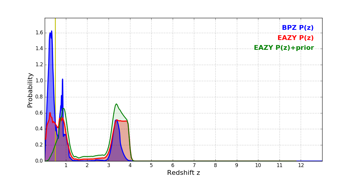 In P(z) plots: Yellow lines mark the cluster redshift z = 0.505,