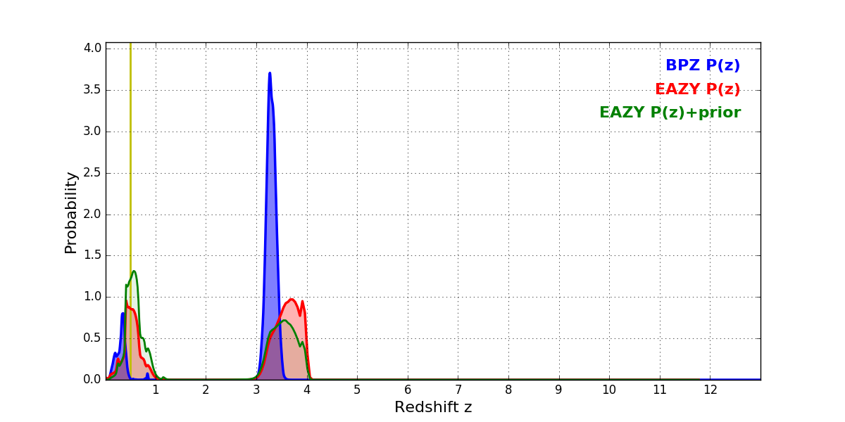 In P(z) plots: Yellow lines mark the cluster redshift z = 0.505,