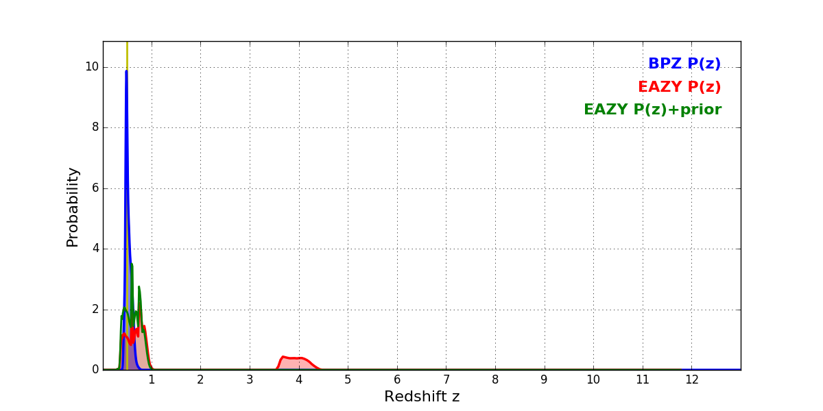 In P(z) plots: Yellow lines mark the cluster redshift z = 0.505,