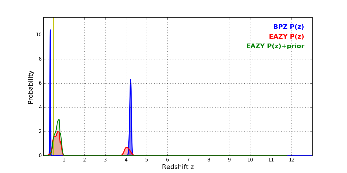 In P(z) plots: Yellow lines mark the cluster redshift z = 0.505,