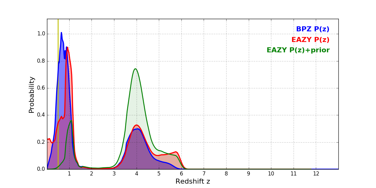 In P(z) plots: Yellow lines mark the cluster redshift z = 0.505,