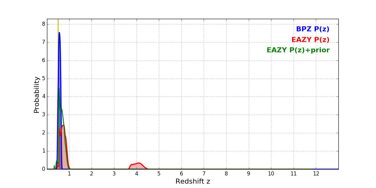 In P(z) plots: Yellow lines mark the cluster redshift z = 0.505,