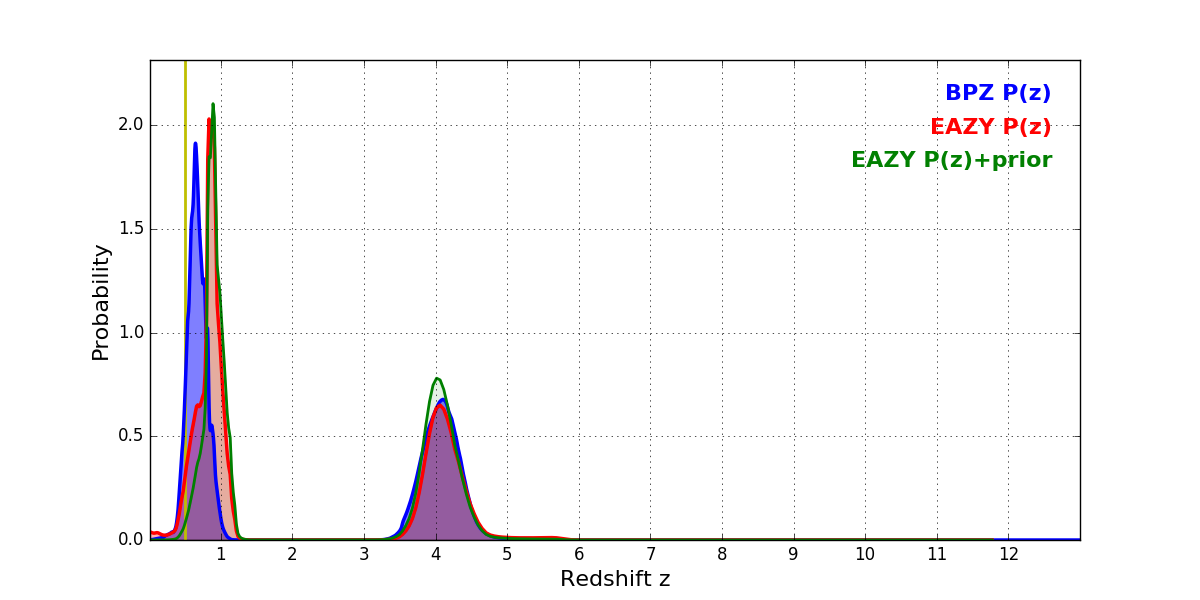 In P(z) plots: Yellow lines mark the cluster redshift z = 0.505,