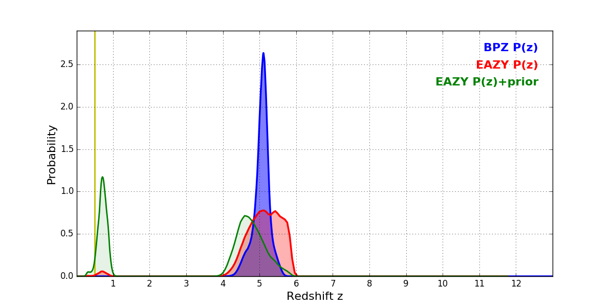 In P(z) plots: Yellow lines mark the cluster redshift z = 0.505,