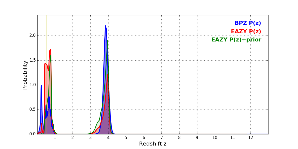 In P(z) plots: Yellow lines mark the cluster redshift z = 0.505,