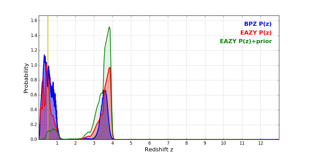 In P(z) plots: Yellow lines mark the cluster redshift z = 0.505,