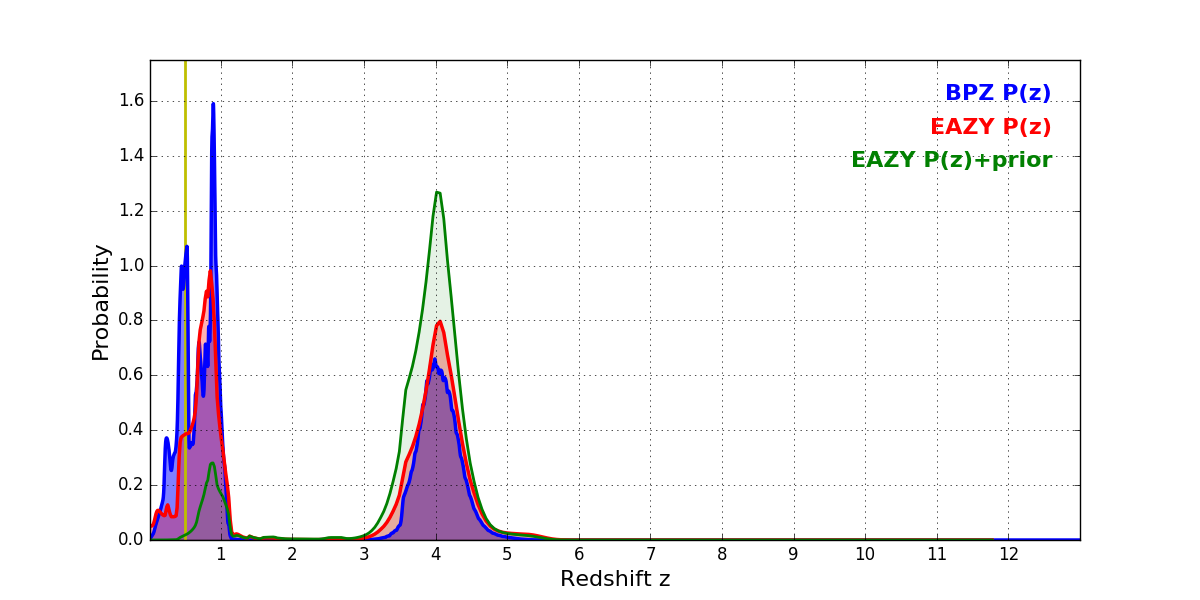 In P(z) plots: Yellow lines mark the cluster redshift z = 0.505,