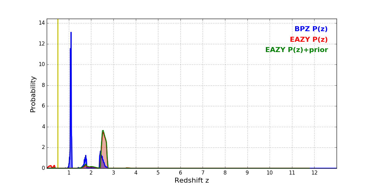 In P(z) plots: Yellow lines mark the cluster redshift z = 0.505,