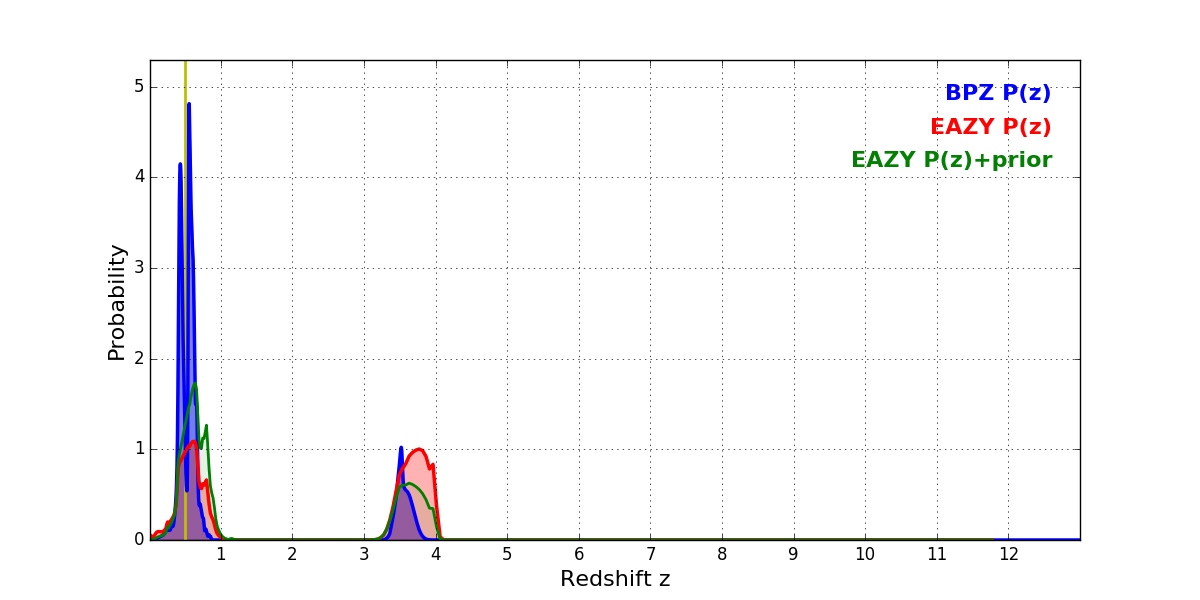 In P(z) plots: Yellow lines mark the cluster redshift z = 0.505,