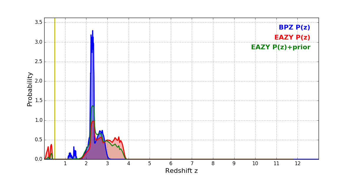 In P(z) plots: Yellow lines mark the cluster redshift z = 0.505,