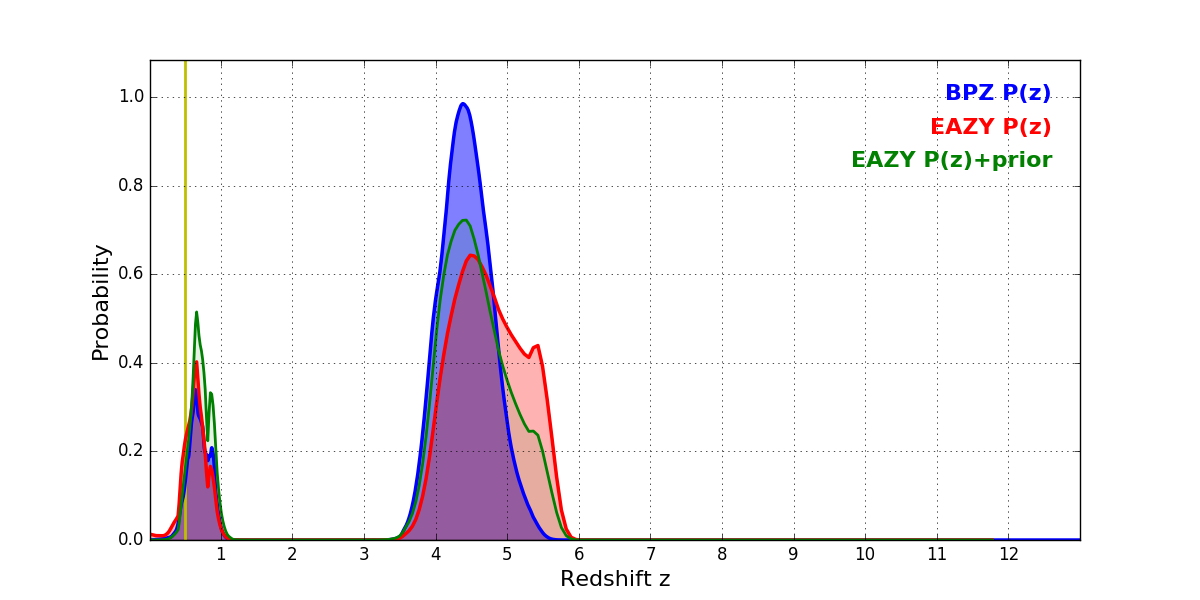 In P(z) plots: Yellow lines mark the cluster redshift z = 0.505,