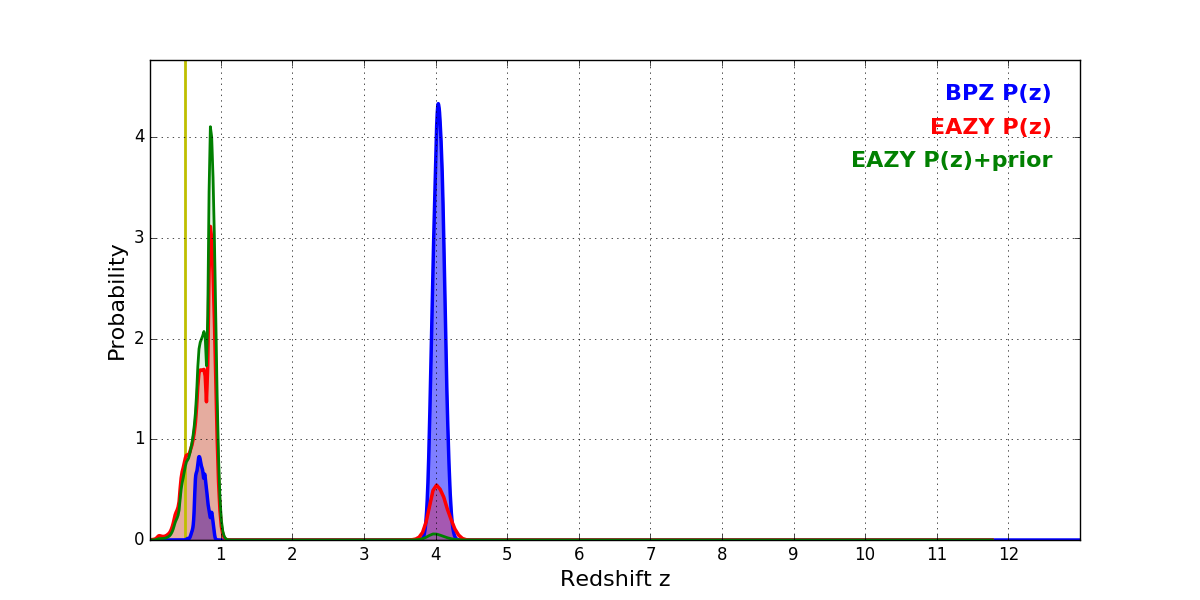 In P(z) plots: Yellow lines mark the cluster redshift z = 0.505,