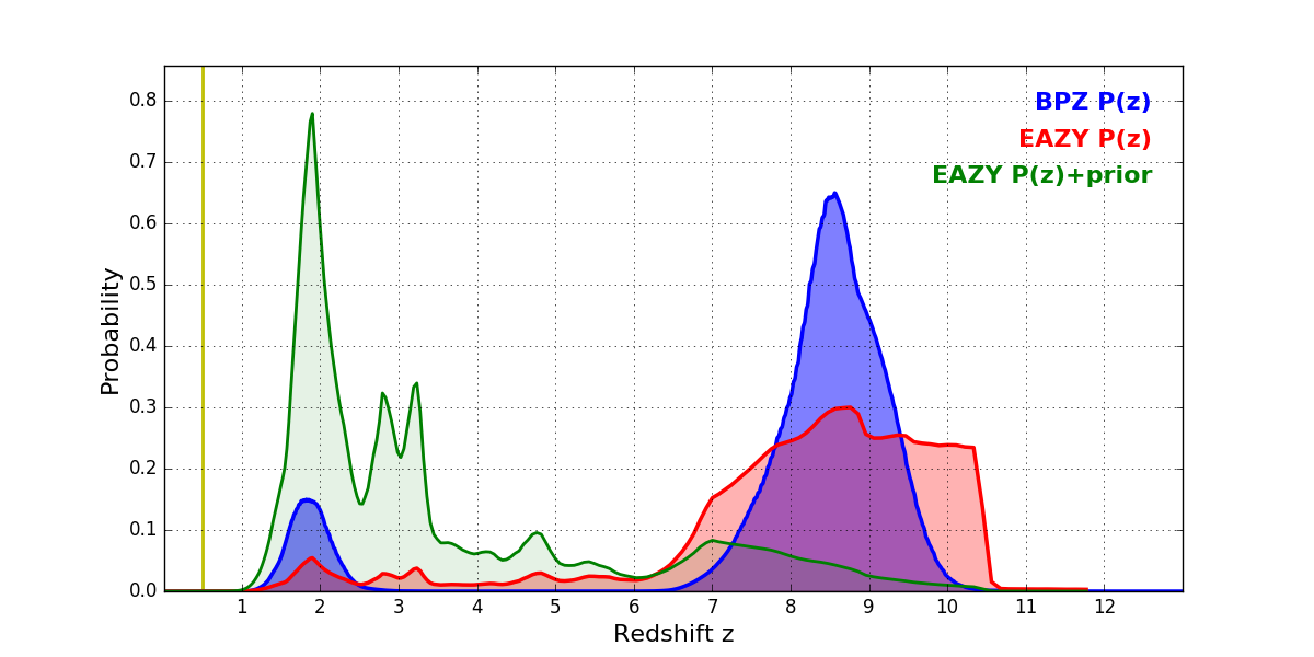 In P(z) plots: Yellow lines mark the cluster redshift z = 0.505,