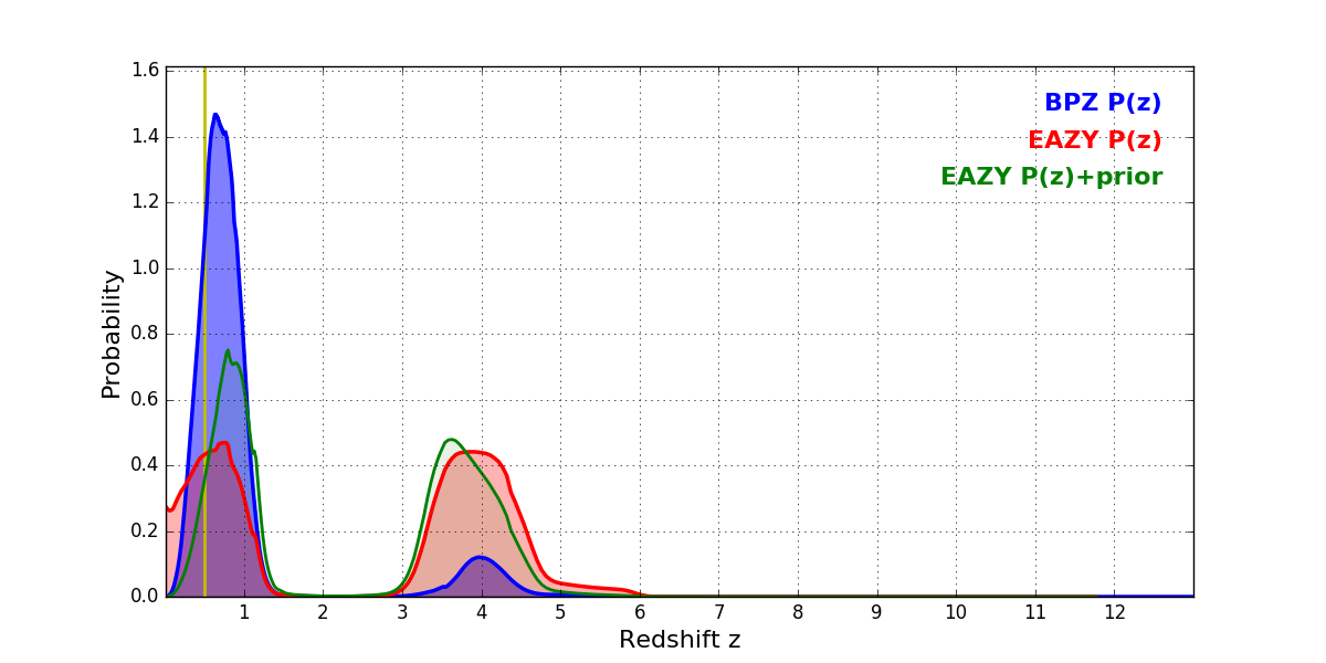 In P(z) plots: Yellow lines mark the cluster redshift z = 0.505,