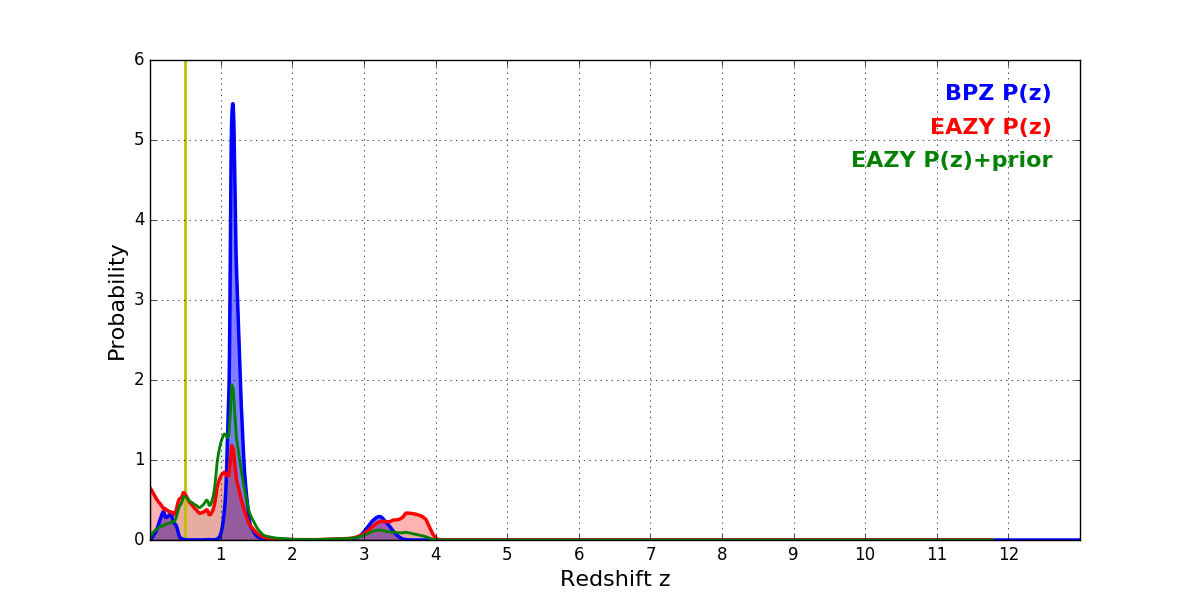 In P(z) plots: Yellow lines mark the cluster redshift z = 0.505,