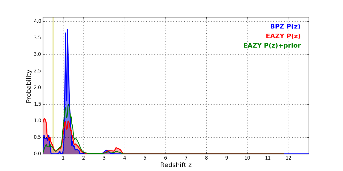 In P(z) plots: Yellow lines mark the cluster redshift z = 0.505,