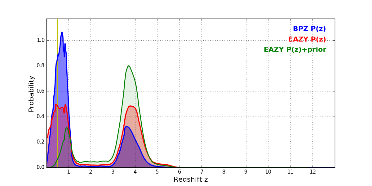 In P(z) plots: Yellow lines mark the cluster redshift z = 0.505,