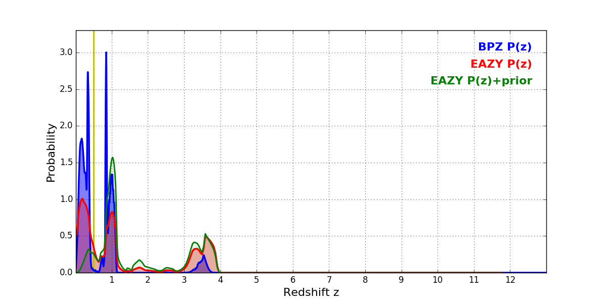 In P(z) plots: Yellow lines mark the cluster redshift z = 0.505,