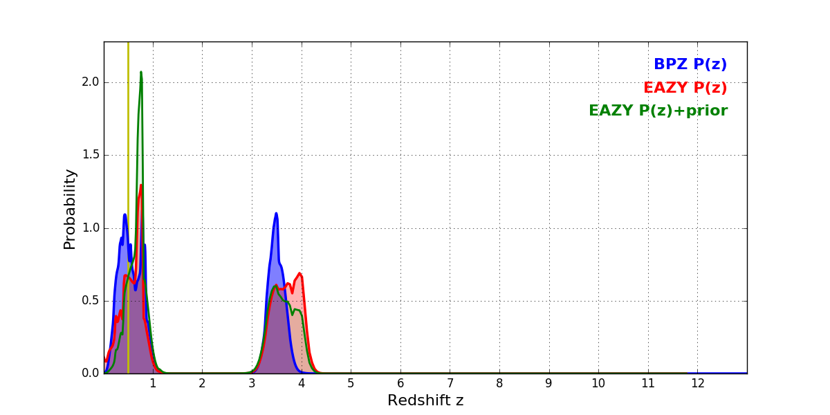 In P(z) plots: Yellow lines mark the cluster redshift z = 0.505,