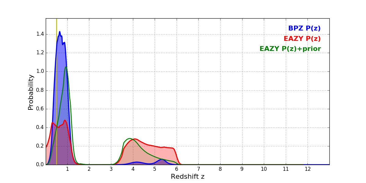In P(z) plots: Yellow lines mark the cluster redshift z = 0.505,