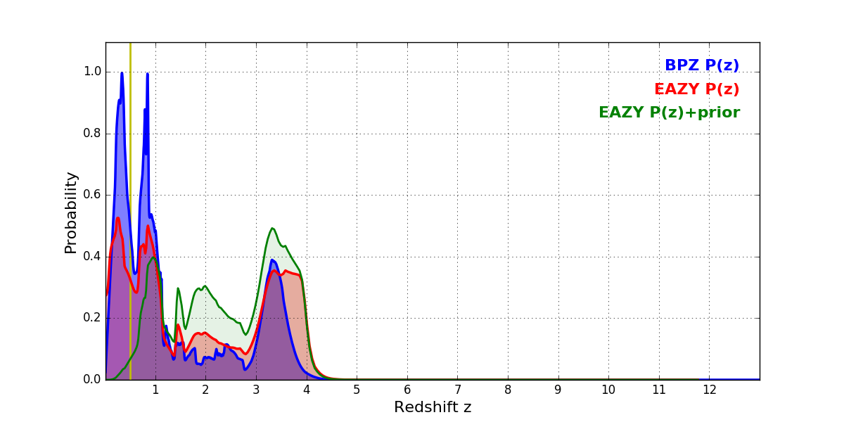 In P(z) plots: Yellow lines mark the cluster redshift z = 0.505,