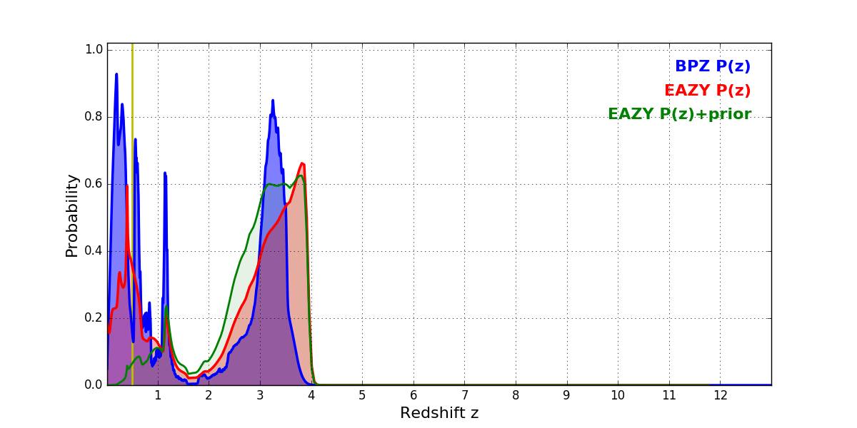 In P(z) plots: Yellow lines mark the cluster redshift z = 0.505,