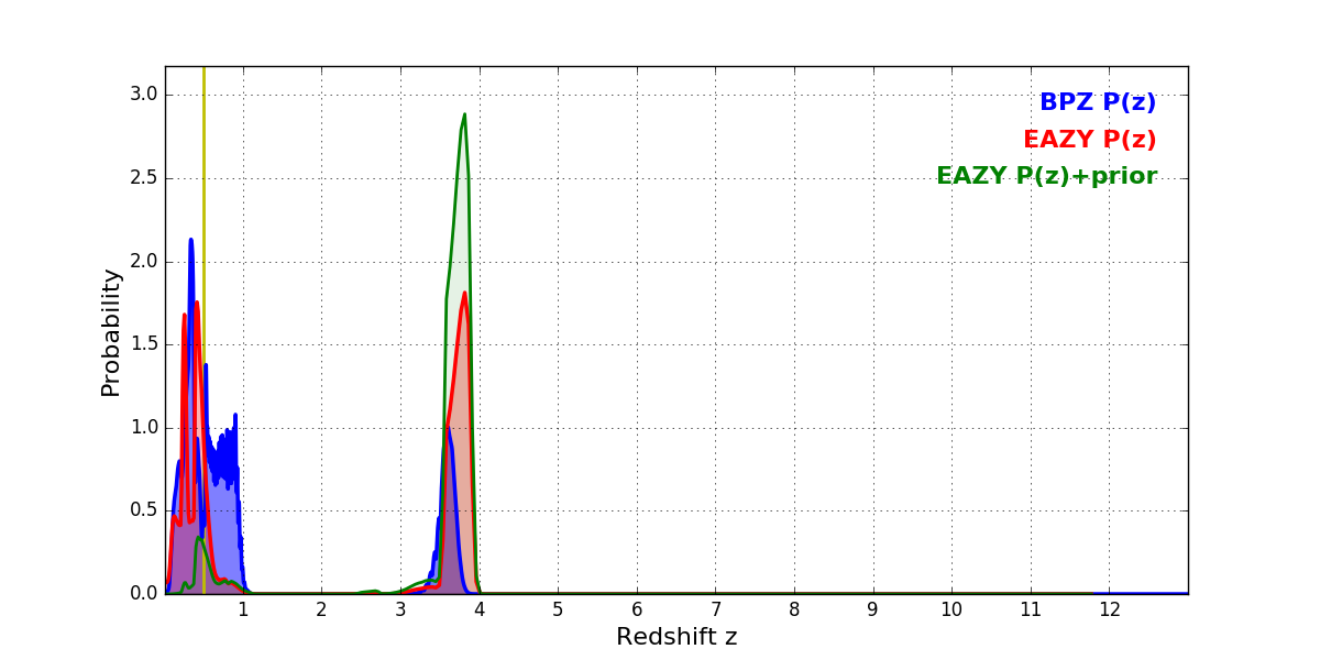 In P(z) plots: Yellow lines mark the cluster redshift z = 0.505,