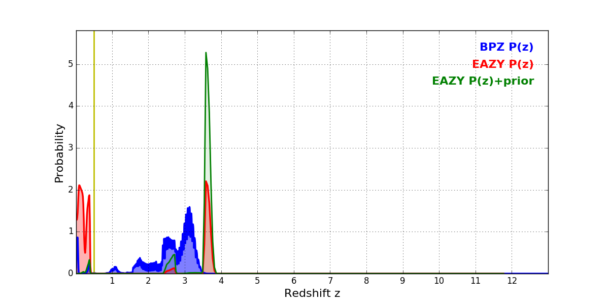 In P(z) plots: Yellow lines mark the cluster redshift z = 0.505,