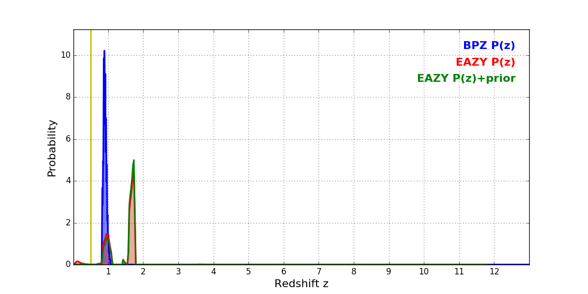 In P(z) plots: Yellow lines mark the cluster redshift z = 0.505,