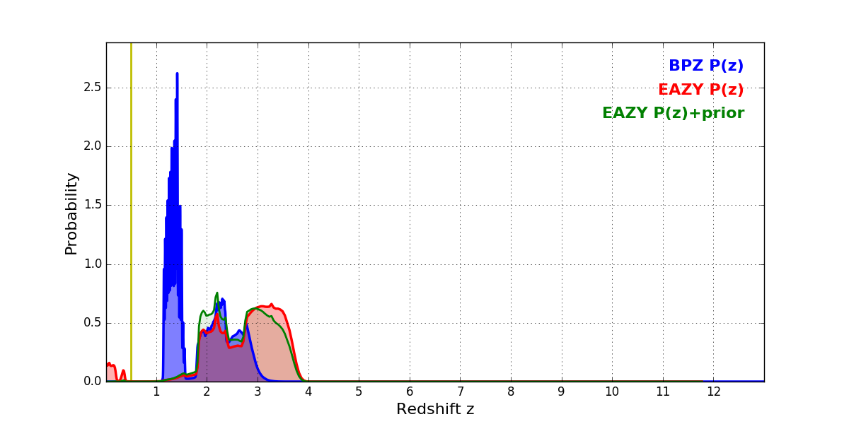In P(z) plots: Yellow lines mark the cluster redshift z = 0.505,